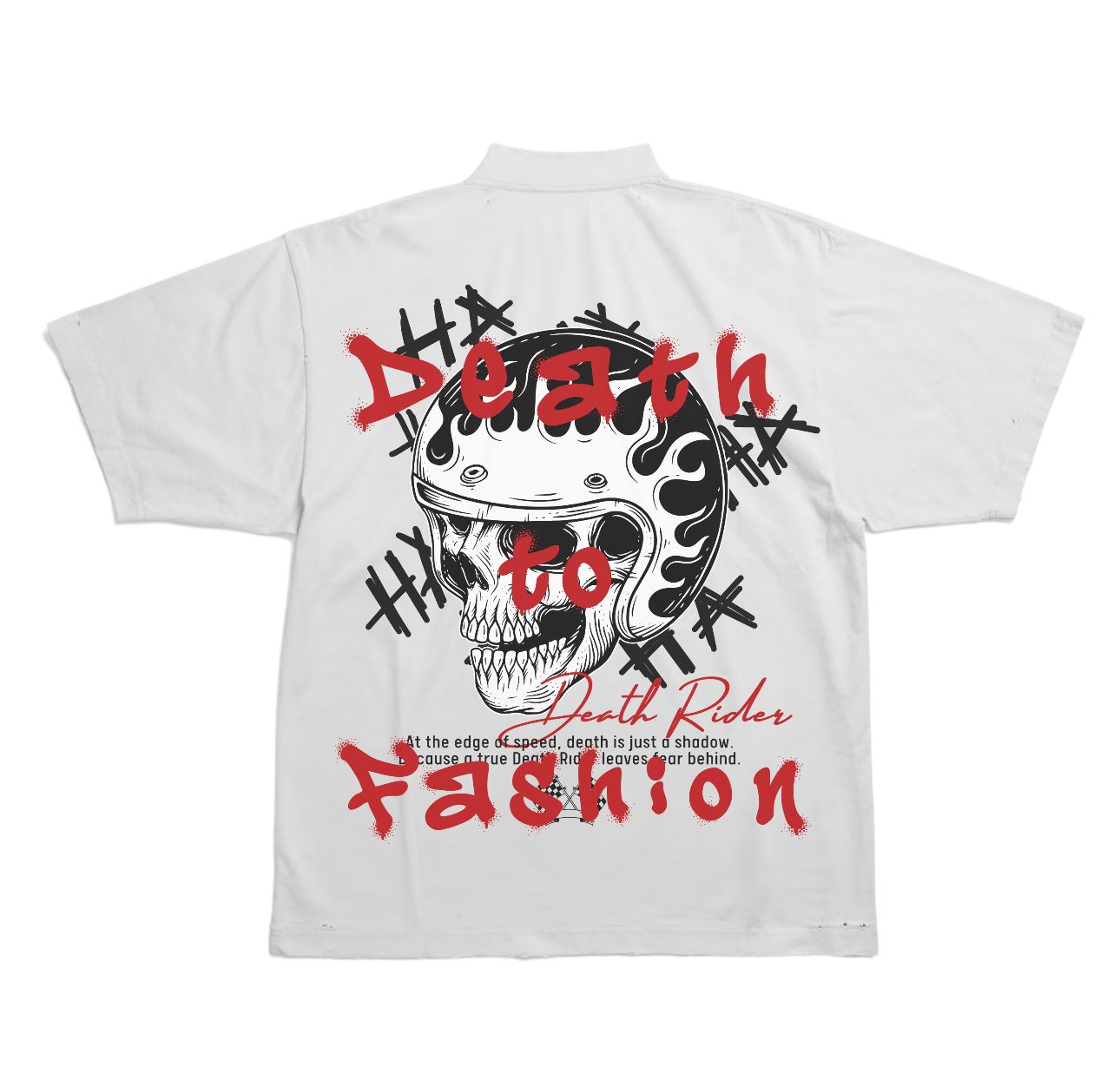 Design: Bold back graphic featuring a stylized skull wearing a motorcycle helmet with bright flames, overlaid with graffiti-style red text reading "Death to Fashion" and "Death Rider."